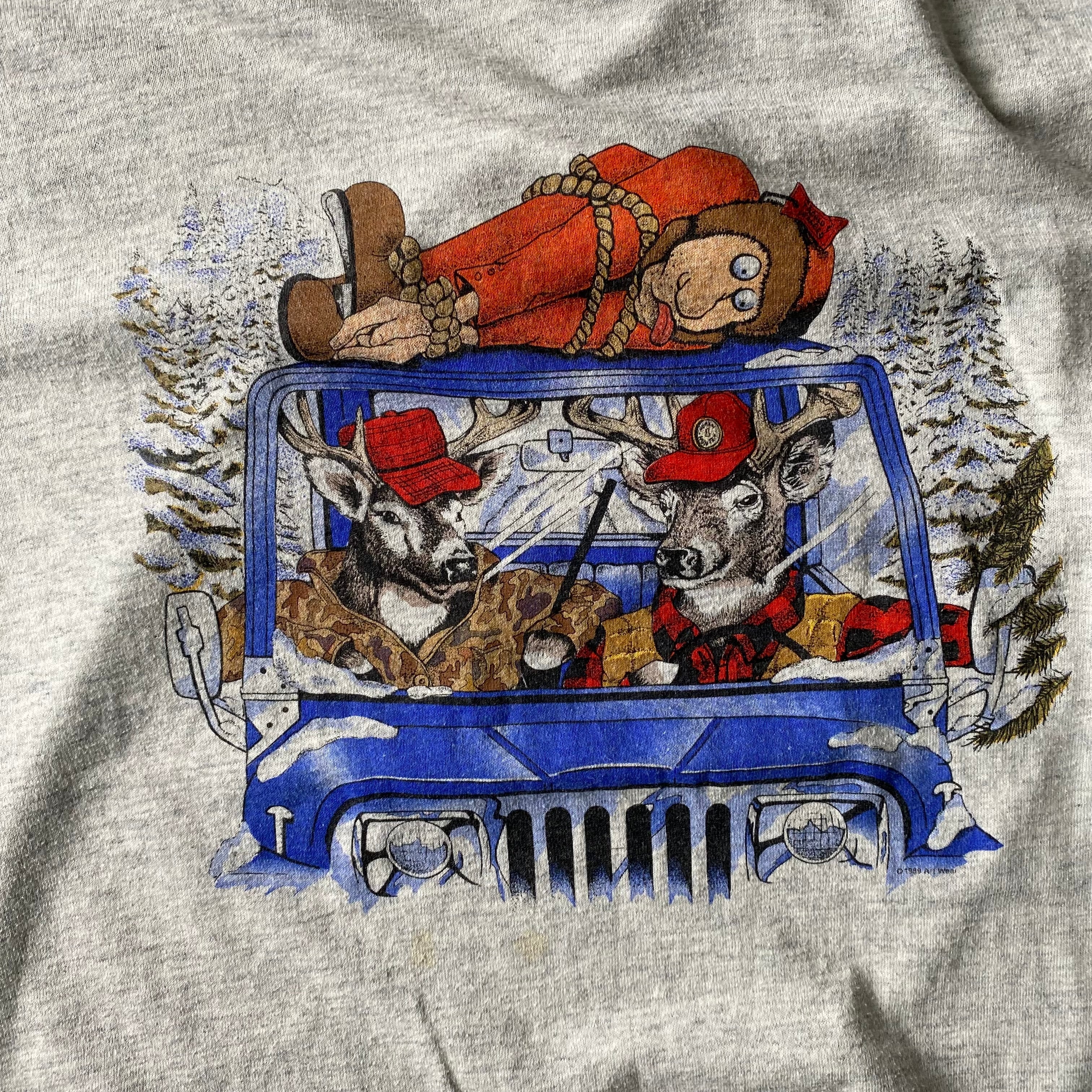 トナカイ狩りに出かけた猟師が逆にトナカイに狩られてしまったブラックジョークなイラストです